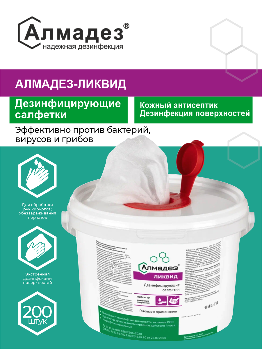 Дезинфицирующие салфетки Алмадез-Ликвид 120 х 200 мм. 200 шт. ведро информация: