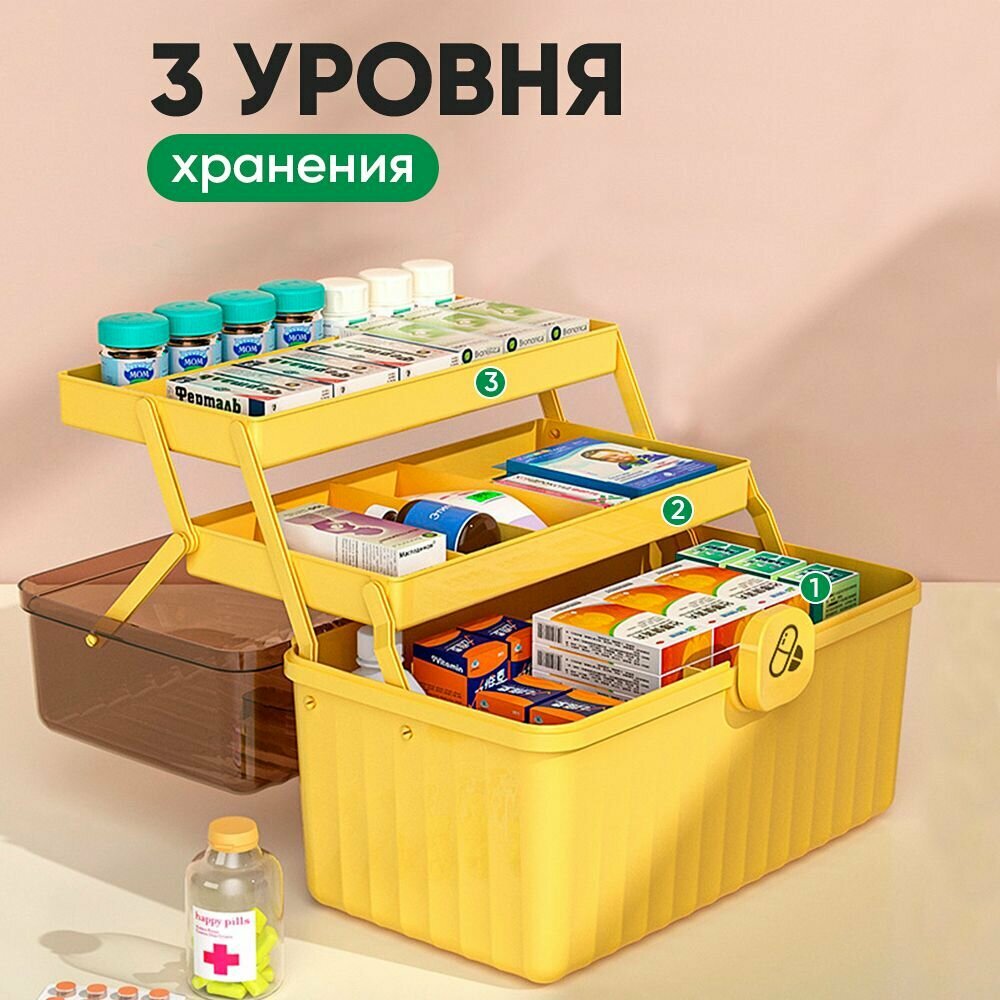 Органайзер для лекарств Oqqi, домашняя аптечка, пластик, желтый, 20х21.8х30 см информация: