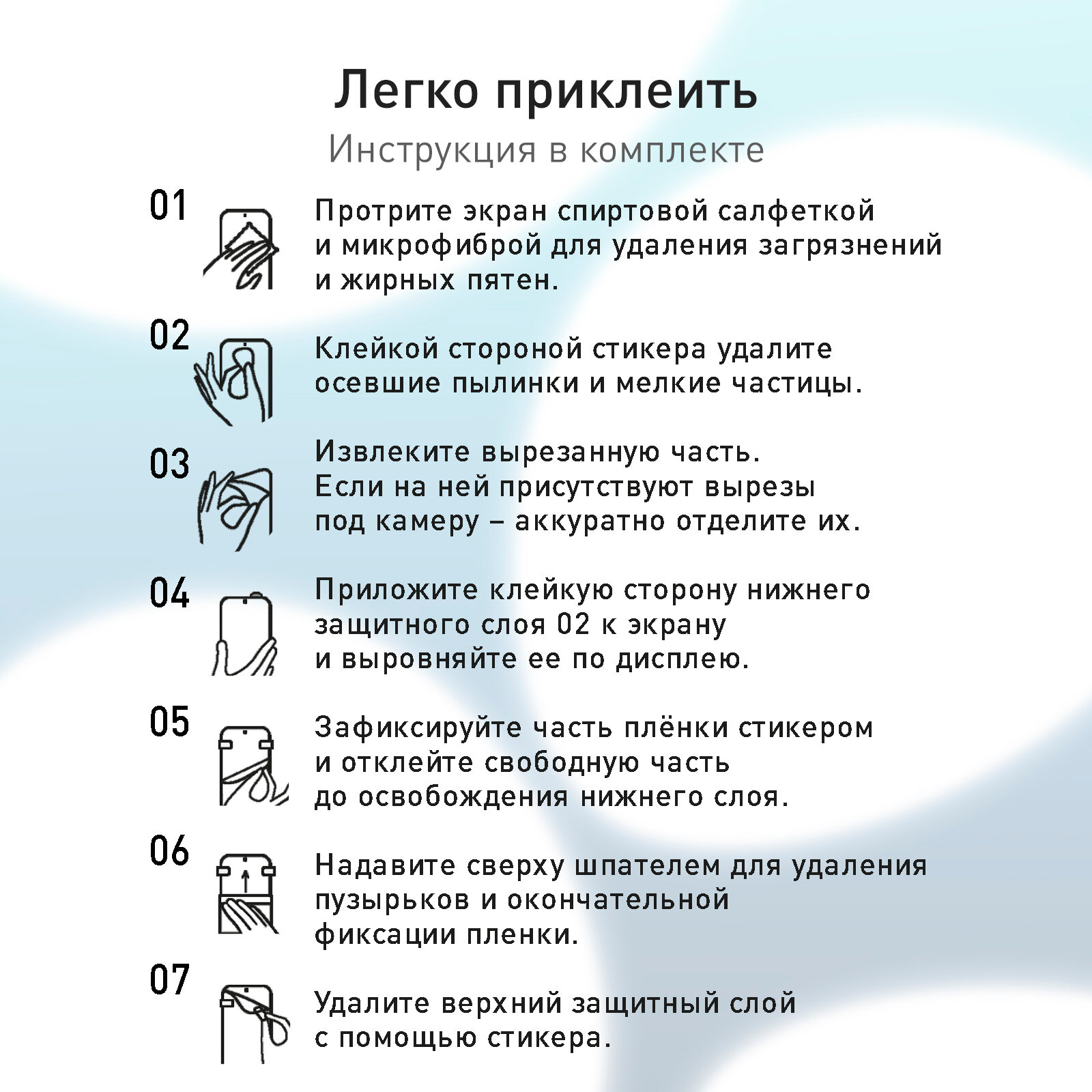 | Подробная комплектация | Гидрогелевая защитная плёнка; спиртовая салфетка; сухая салфетка; стикеры для удаления пыли |