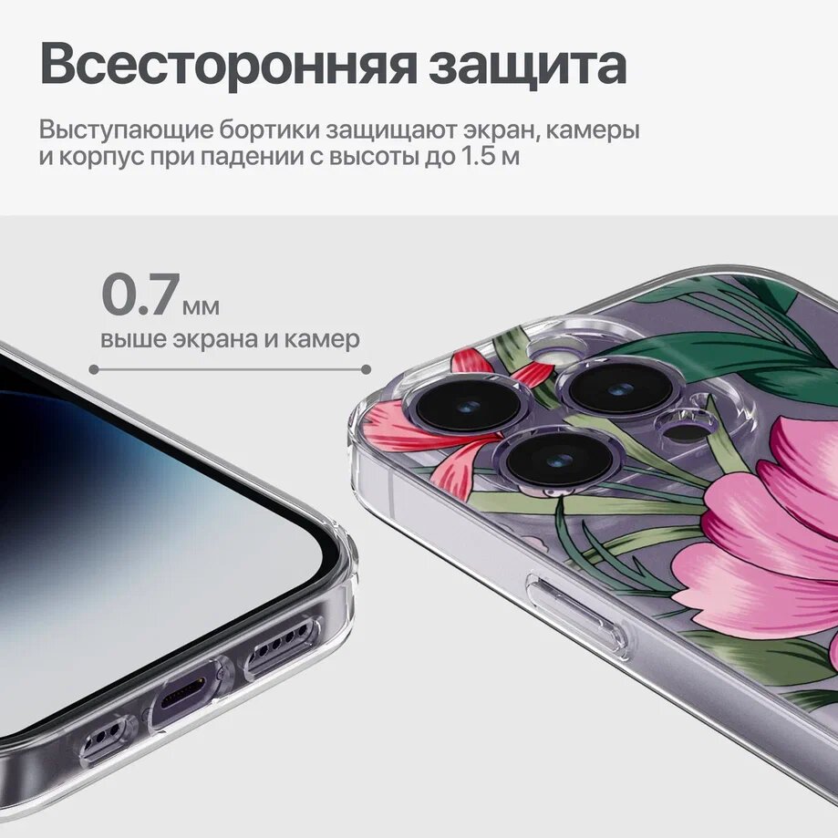 Отзывы на Прозрачный чехол на iPhone 14 Pro / Айфон 14 Про накладка с принтом "Pink flower"