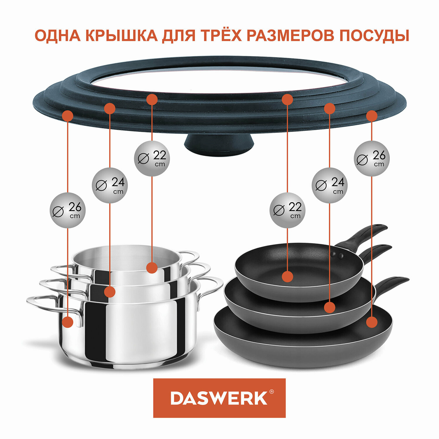 Крышка для сковороды и кастрюли DASWERK универсальная, 3 размера, 22-24-26 см, антрацит 607586