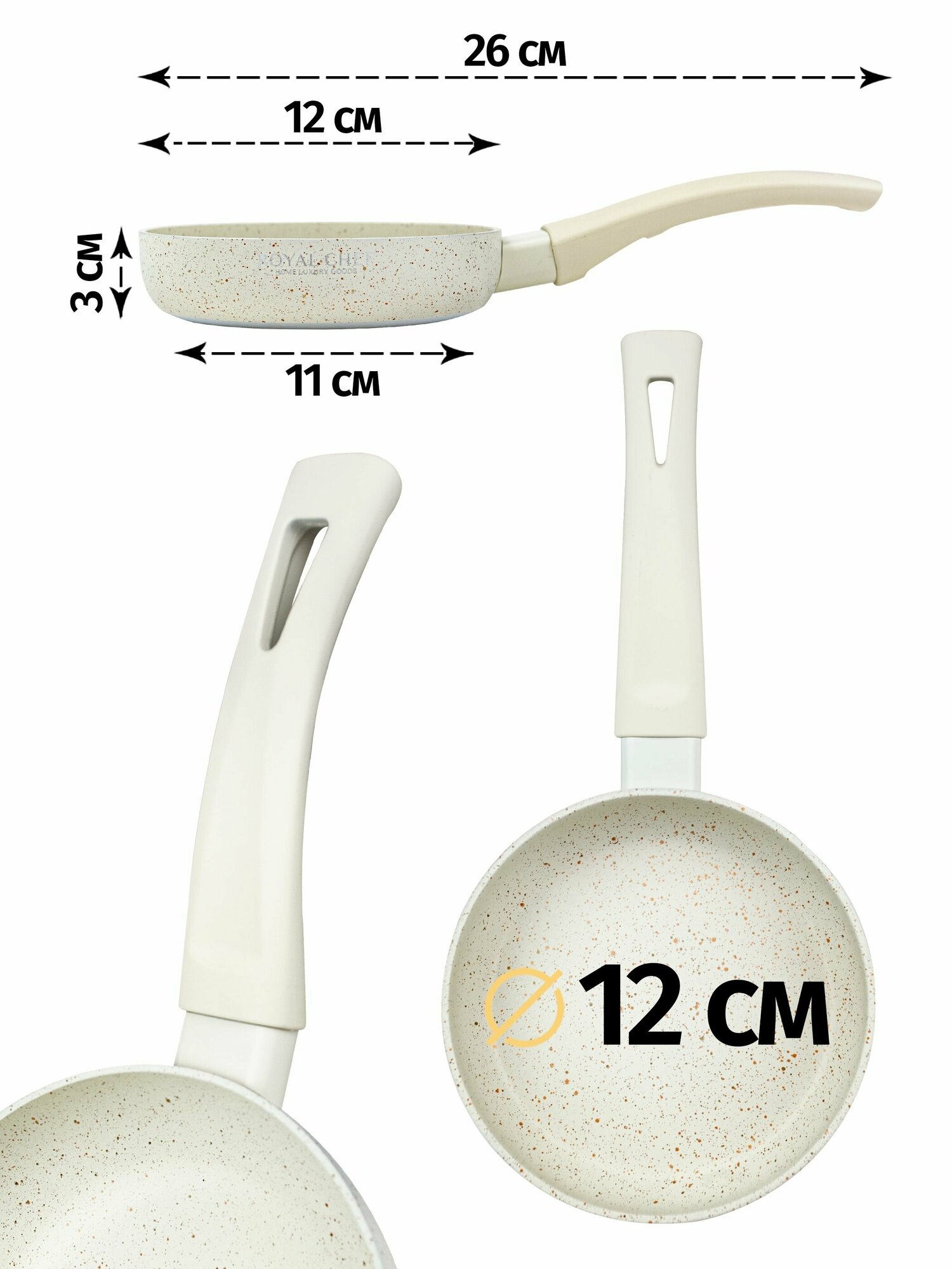 Отзывы на Сковорода без крышки Royal chef. Диаметр 12 см. Антипригарное покрытие, несъемная ручка, материал алюминий. Цвет кремовый.