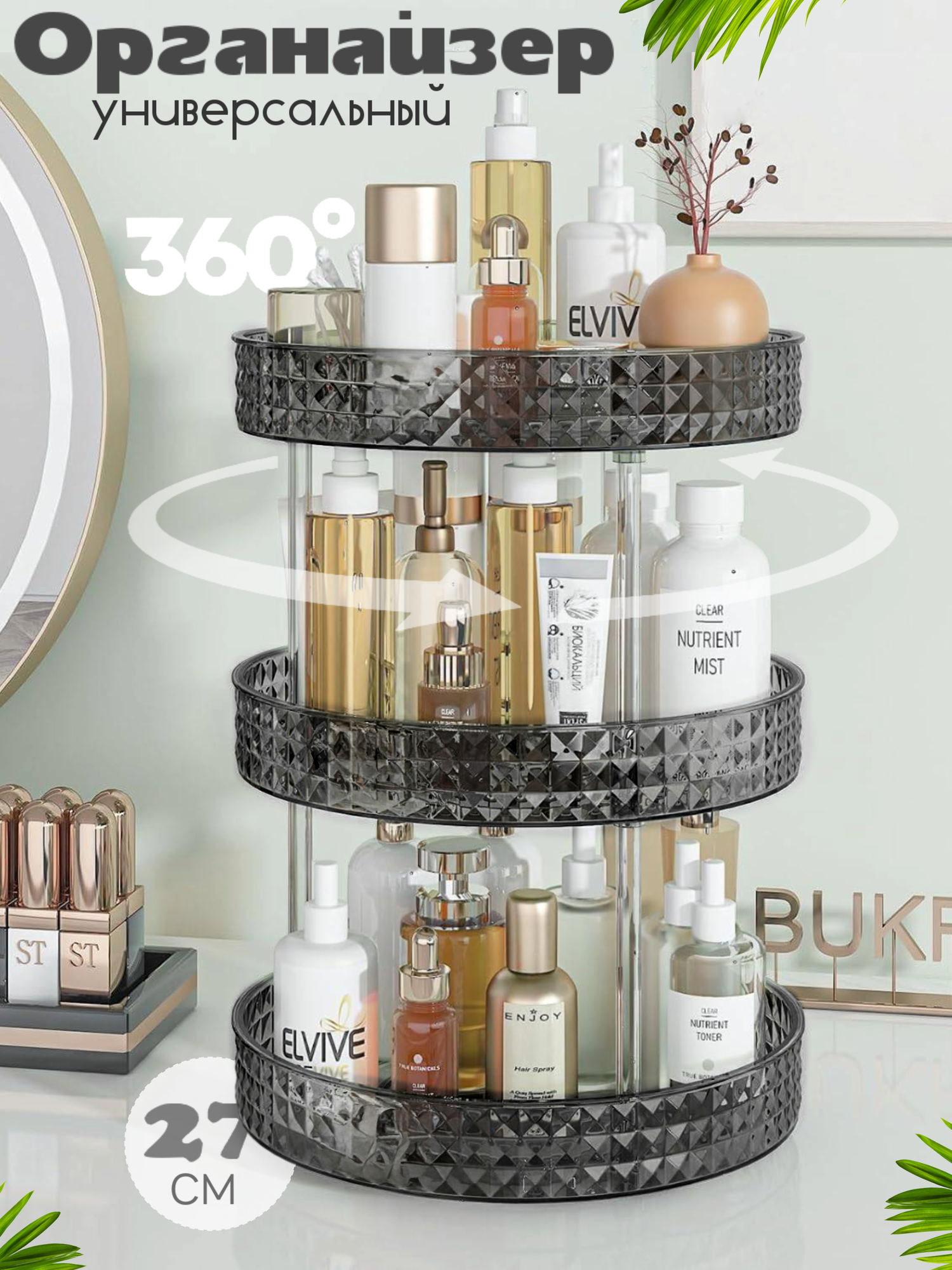 10 цен на Органайзер трехъярусный вращающийся поднос для косметики 27 см