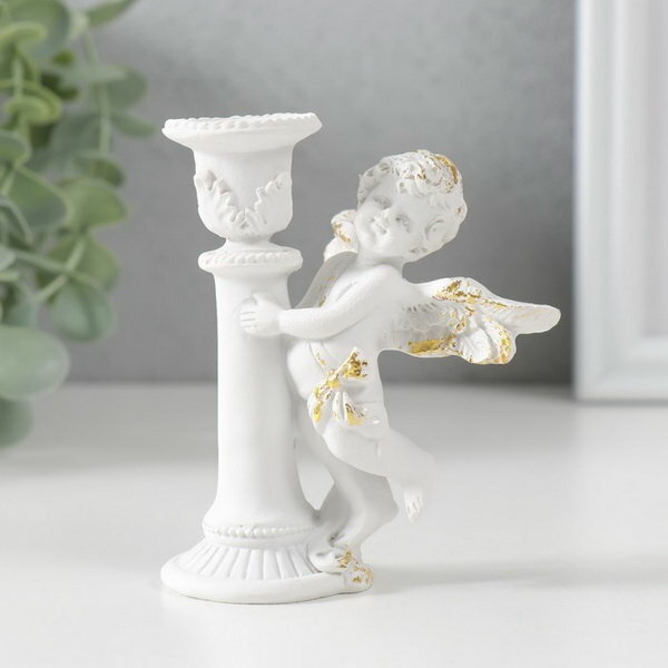 10 цен на Подсвечник полистоун на 1 свечу "Ангел на колонне" d-1.2 см белый с золотом 9.8х8х7 см
