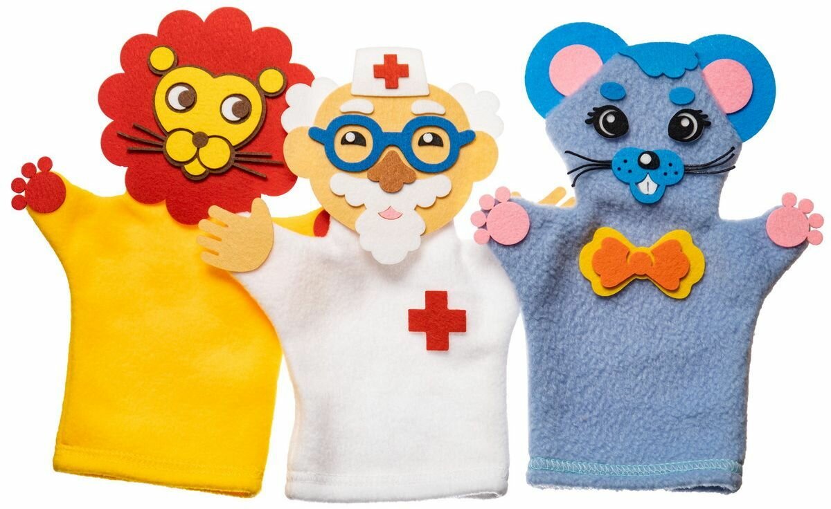 Кукла-рукавичка на руку Smile Decor "Доктор Айболит и компания", мягкая игрушка-перчатка для кукольного театра, набор из 3 перчаточных кукл из флиса и фетра информация: