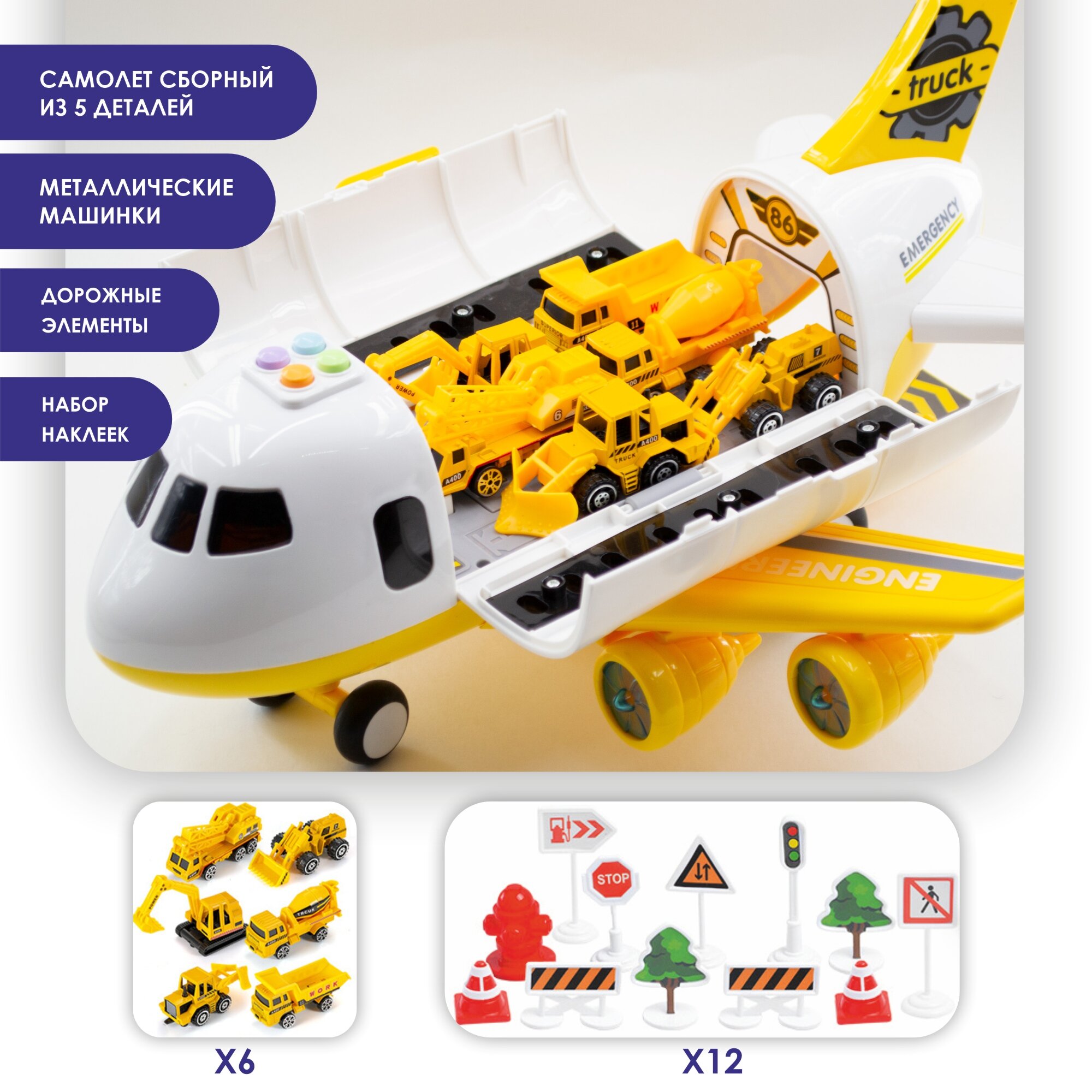 | Комплектация | Самолёт парковка 1шт. Металлические машинки пожарная техника 6шт. Дорожные знаки и дополнительные аксессуары 12шт. |