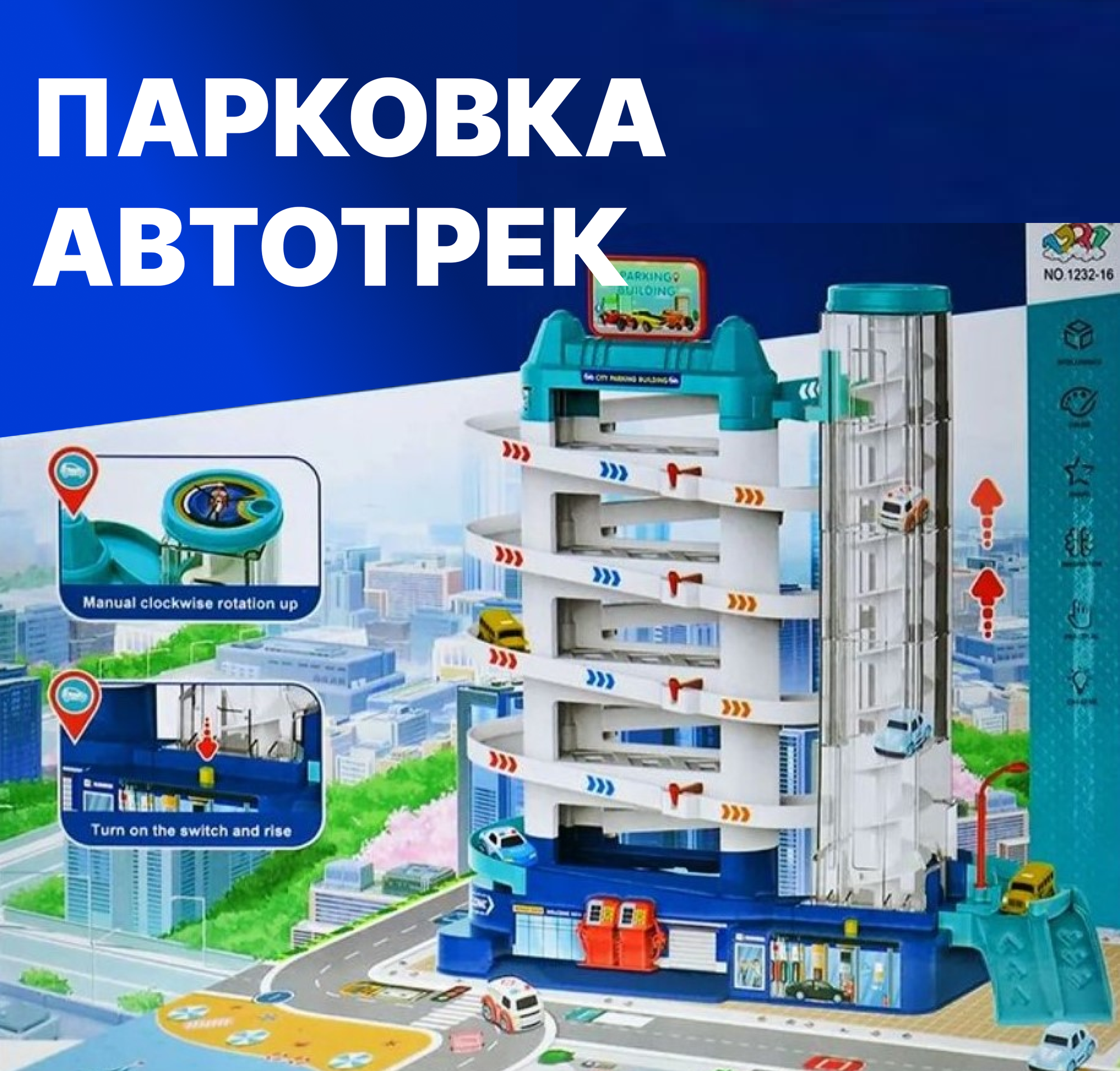 Детский автотрек, 8 машинок, спиральный электролифт, с наклейками, интерактивная игра информация: