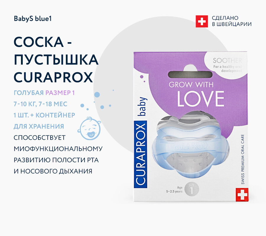 Curaprox голубая, размер 1 (7-10 кг, 7-18 мес.), 1 шт. + контейнер для стерилизации. BabyS light blue 1 single информация: