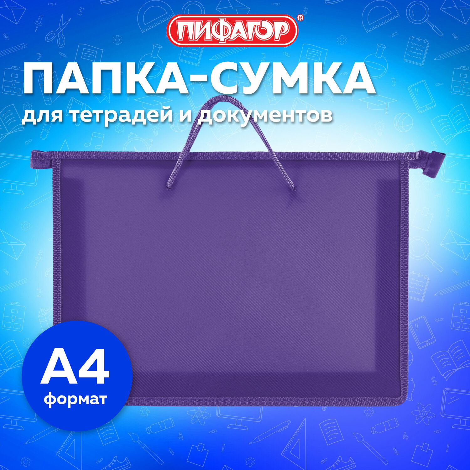 Папка на молнии с ручками пифагор, А4, пластик, молния сверху, однотонная фиолетовая, 228237