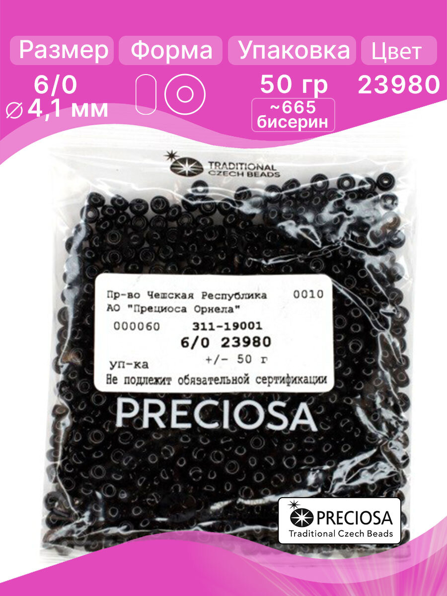 Бисер чешский PRECIOSA круглый 6/0 23980 черный непрозрачный, 50г информация: