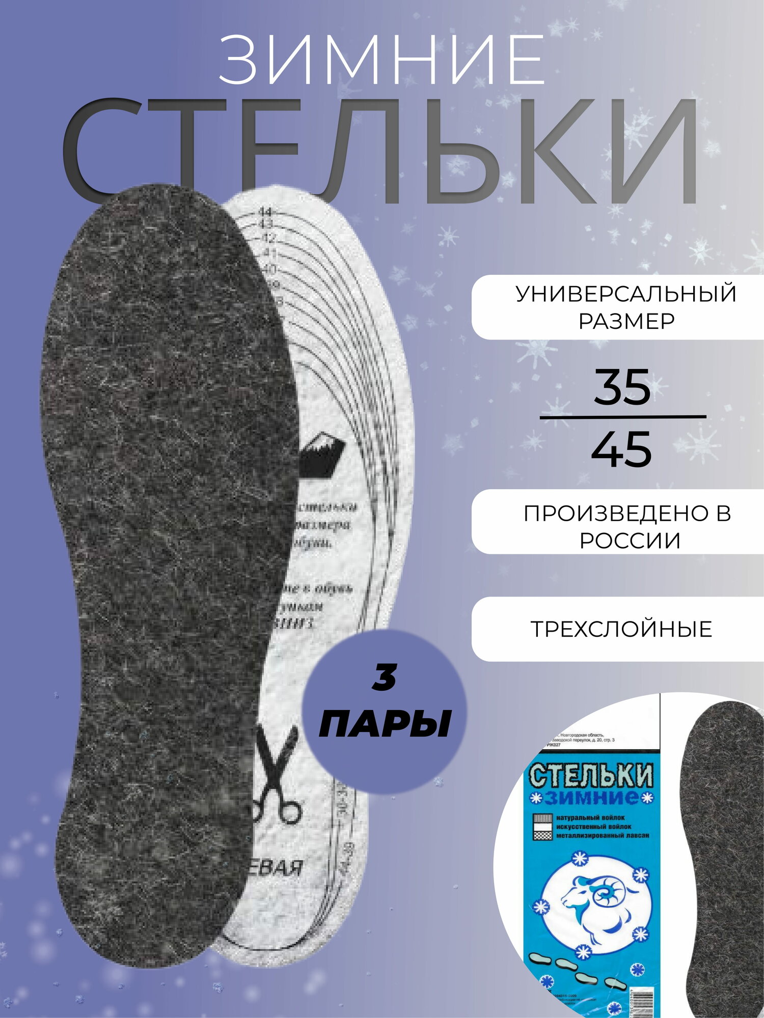 10 цен на Стельки для обуви "Зимние"Двойной войлок.Упаковка-3-Пары Металлизированный лавсан.Термостельки.Универсальный размер 35-45,