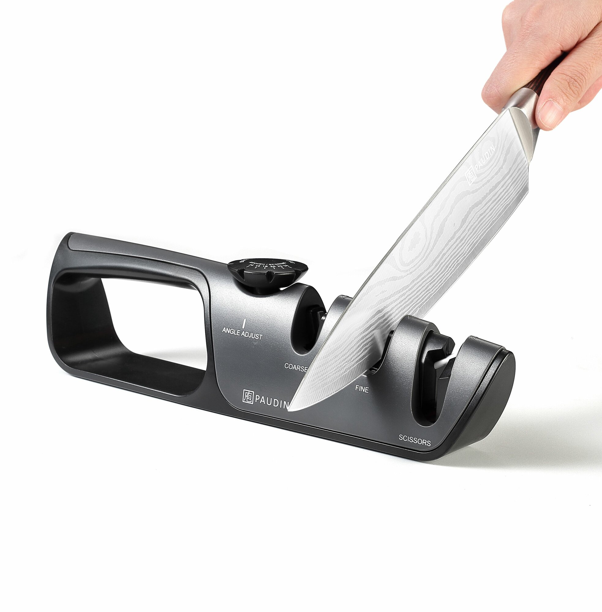 PAUDIN Pro / Точилка для ножей и ножниц ножеточка ручная настольная, механическая, трехступенчатая, регулируемая