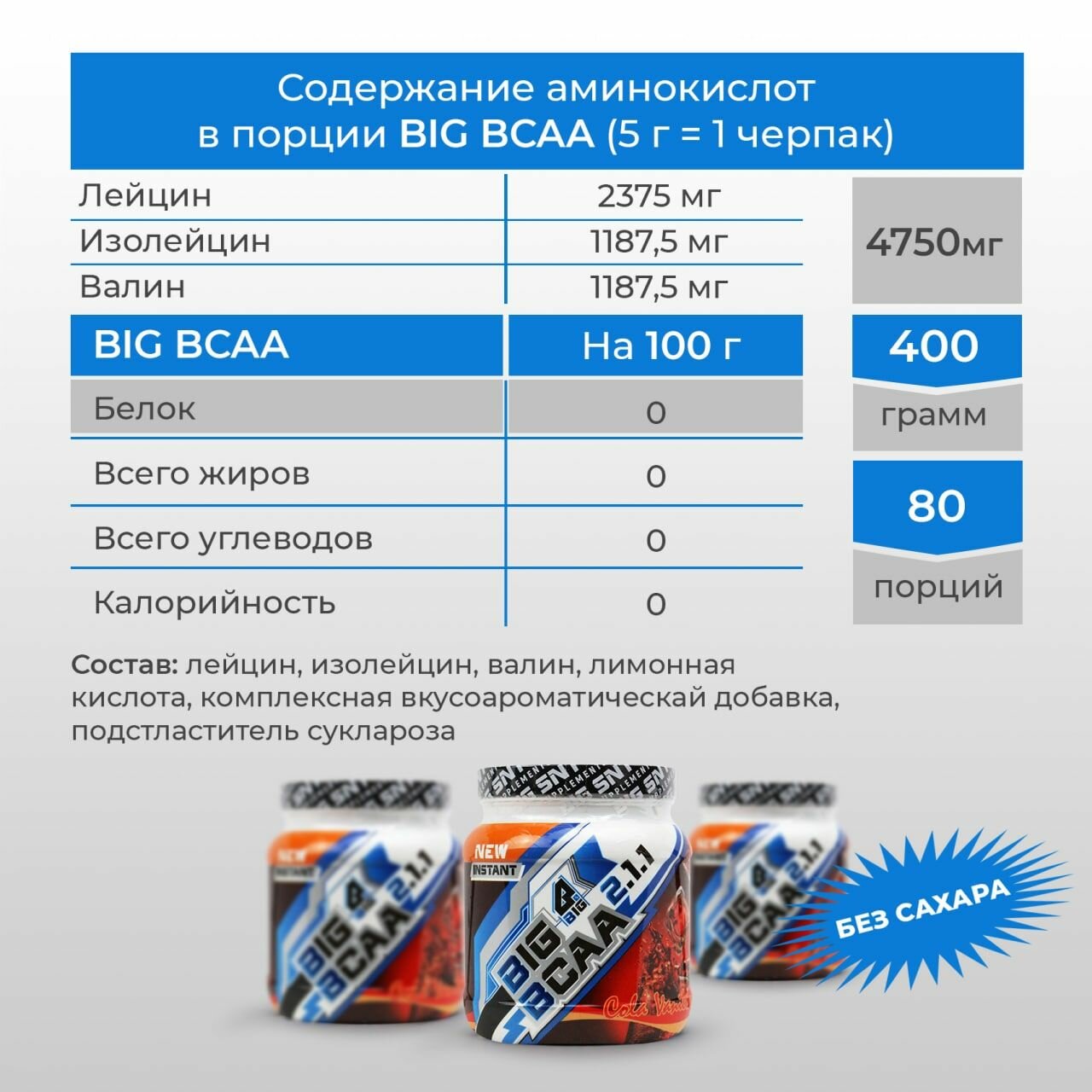 BCAA 2:1:1 BIGSNT/ комплекс аминокислот для роста мышц / порошок, 400 грамм (80 порций), вкус Кока-кола информация:
