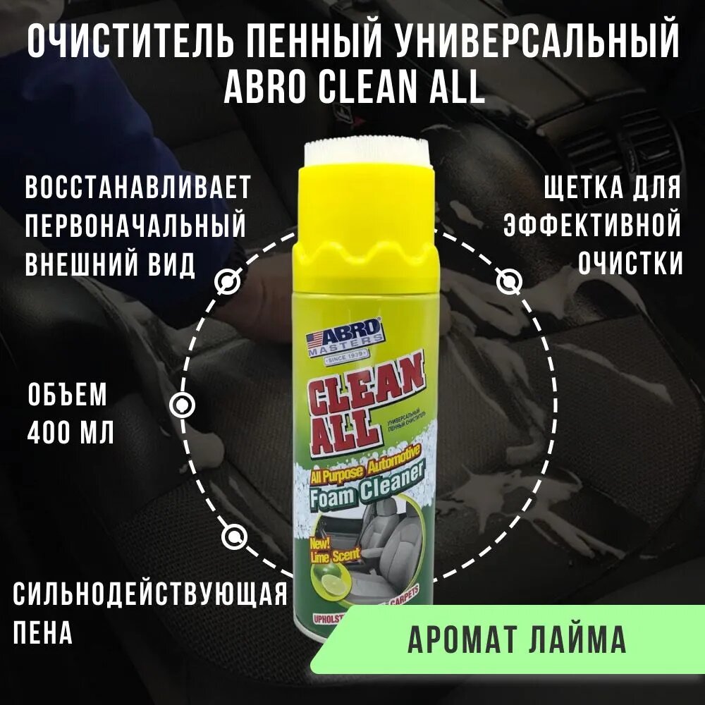 | Дополнительная информация | Универсальный очиститель ABRO идеален для очистки любых моющихся поверхностей, как салона автомобиля, так и дома. Сильнодействующая пена эффективно удаляет пятна и разводы с виниловых, а также напольных и хромированных поверхностей автомобиля. Не следует применять для очистки стекол или ЛКП. |