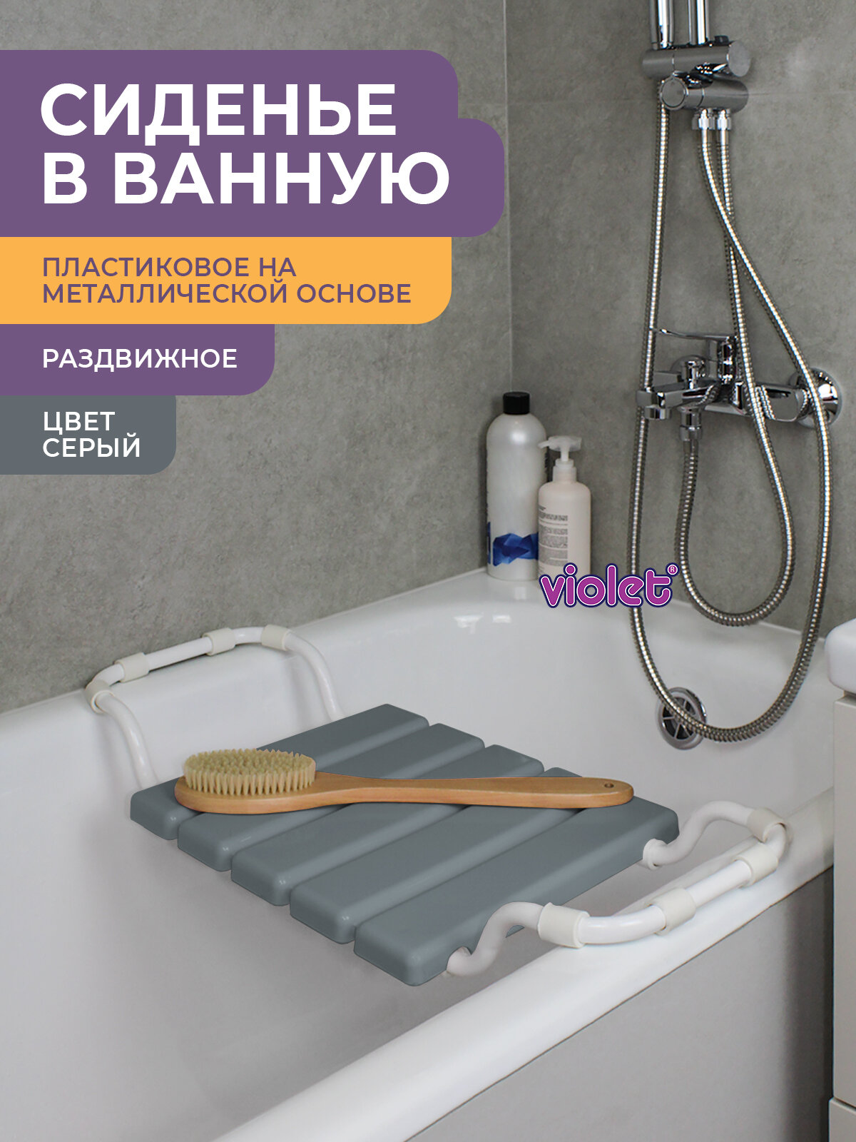 Сиденье в ванну раздвижное Violet, пластиковое, металлический каркас, серое