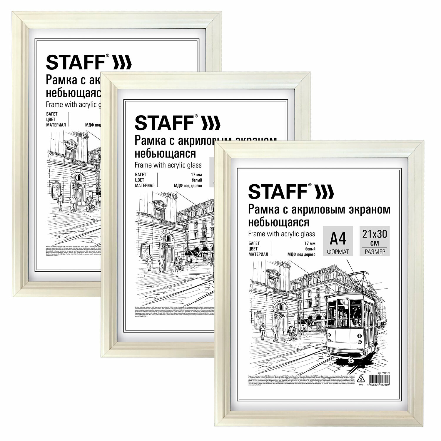 Рамка 21х30 см небьющаяся, Комплект 3 шт., багет 17 мм Мдф, Staff Carven, белая, 391325 информация: