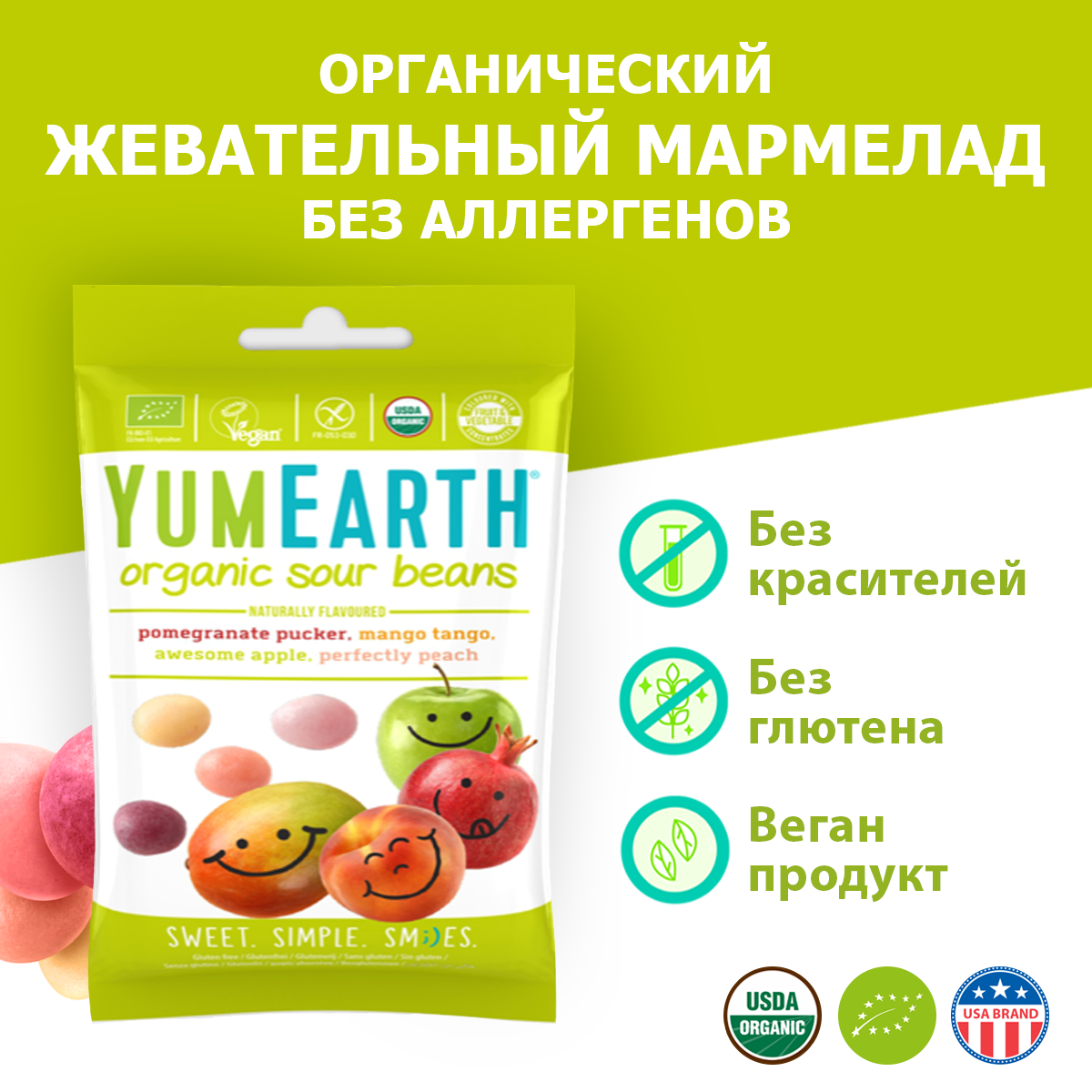 Мармелад YumEarth Organic Sour Beans, органик, без глютена и без аллергенов, 4 вкуса, 50 г. информация: