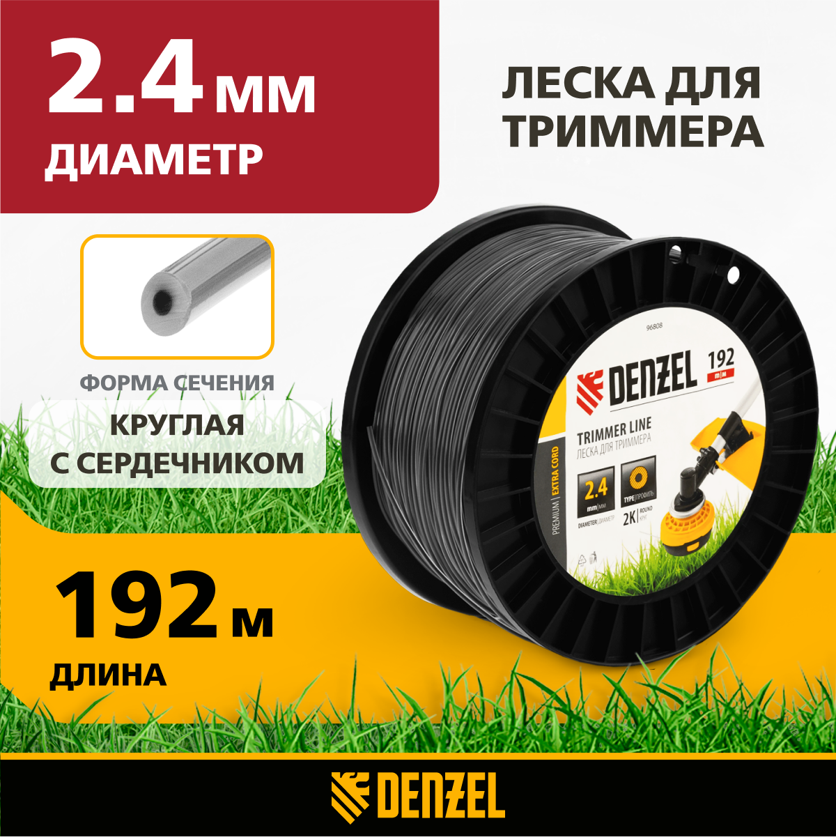 Леска для триммера двухкомпонентная Denzel круглая 2, 4мм х 192м, на DIN катушке EXTRA CORD 96808 информация: