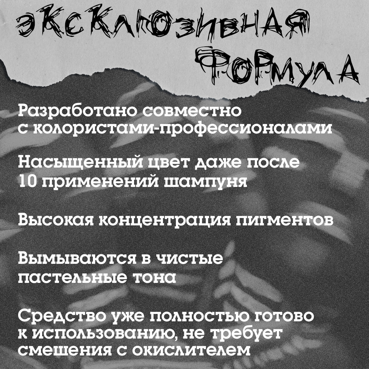 | Способ применения | СПОСОБ ПРИМЕНЕНИЯ: наденьте перчатки. Равномерно нанесите окрашивающую смесь на чистые сухие волосы. Краситель необходимо практически «втирать» в волосы. Выдержите от 20 до 30 минут, в зависимости от желаемой интенсивности цвета. По истечении времени воздействия тщательно смойте пигмент обильным количеством теплой воды, пока она не станет прозрачной. Не используйте шампунь. Краситель может оставлять следы на полотенце и подушке. Для максимальной яркости и стойкости рекомендуем предварительно обесцветить волосы. |