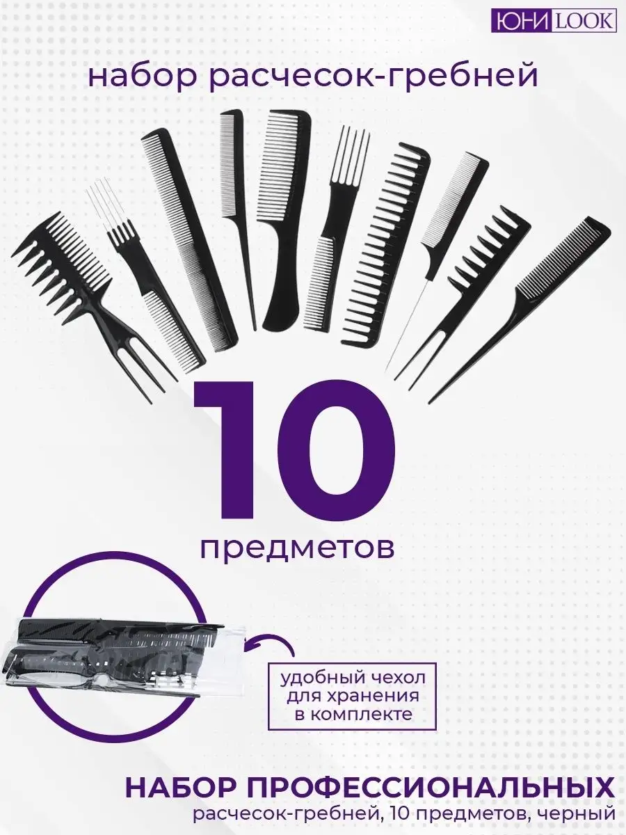 10 цен на Набор профессиональных расчесок-гребней ЮниLook 10пр., пластик, черный