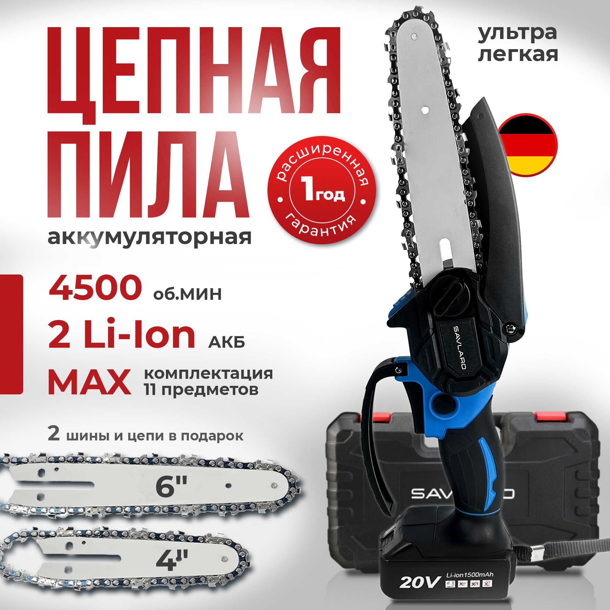Пила цепная аккумуляторная Savlaro с двумя аккумуляторами информация: