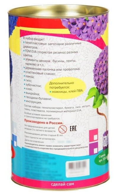 | Состав набора | пенопластовая заготовка шар 8 см,, разноцветные листы FOM EVA, клей, шпажки и зубочистки, ленты, бусины, кружево, гипс, стакан, ложка, выкройка, инструкция с пошаговым описанием и фото |