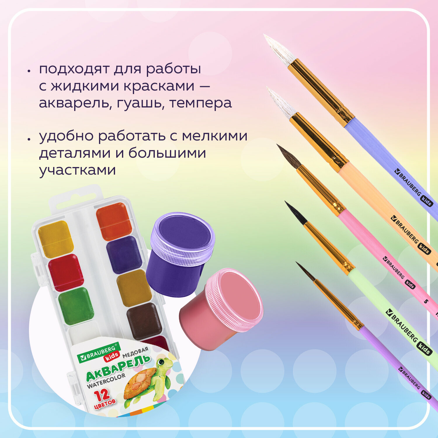 Кисти Brauberg Kids, 201080, для рисования 5 шт, кисточки № 2 3 5 6 8, белка, коза, пони 717 ₽