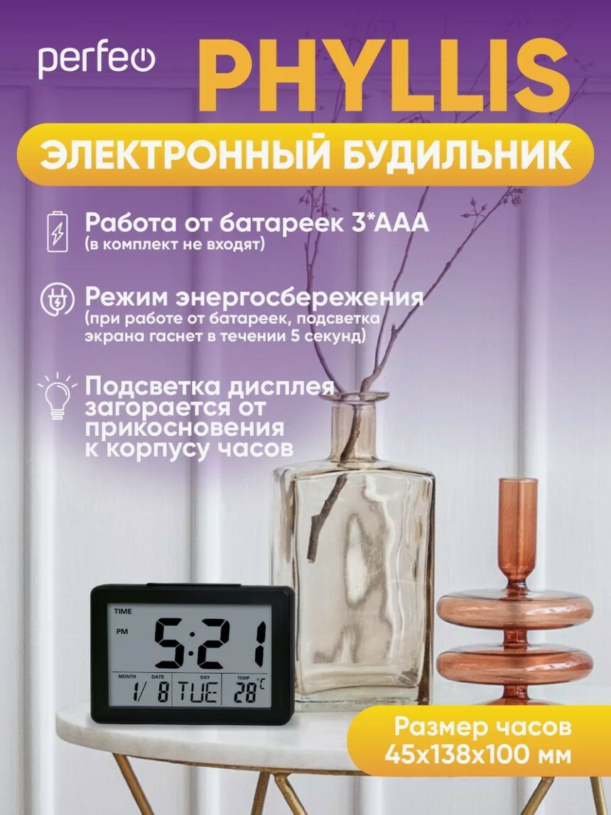 Часы-будильник-термометр PERFEO Phyllis PF-F2619 (черный) информация: