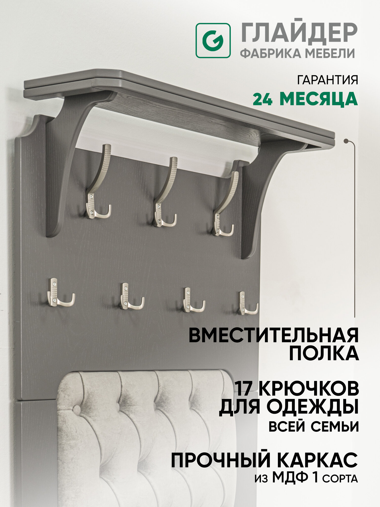 Вешалка настенная Glider Патриция с полкой, 7 крючков, цвет серый, МДФ информация: