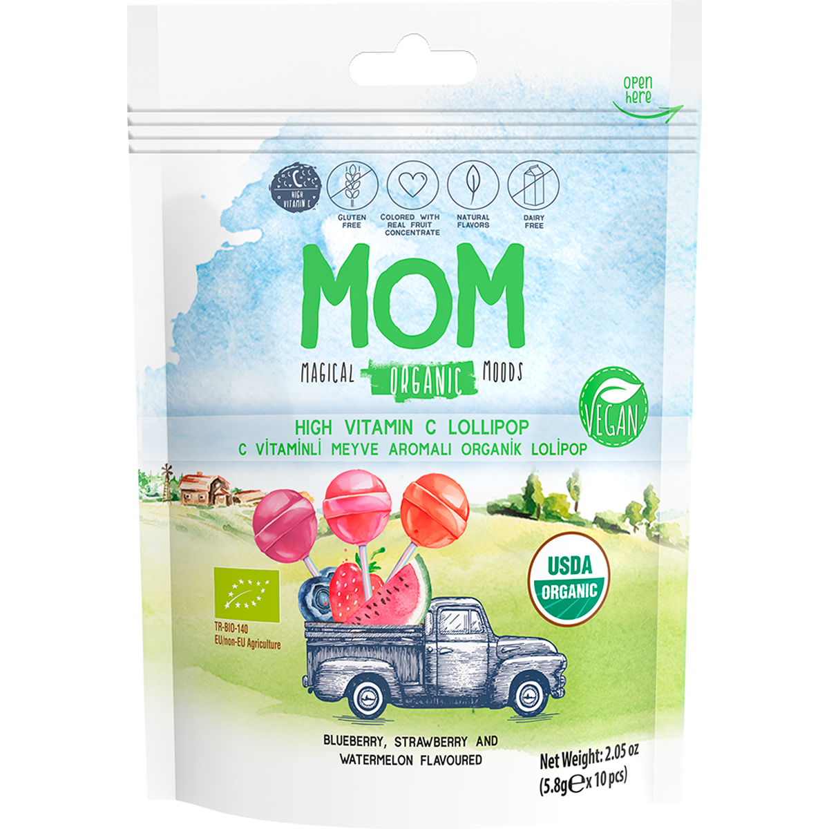 Леденцы MOM (MAGICAL ORGANIC MOODS), органик, без глютена и без аллергенов, с витамином С, 3 вкуса, 10 леденцов, 58 г. информация: