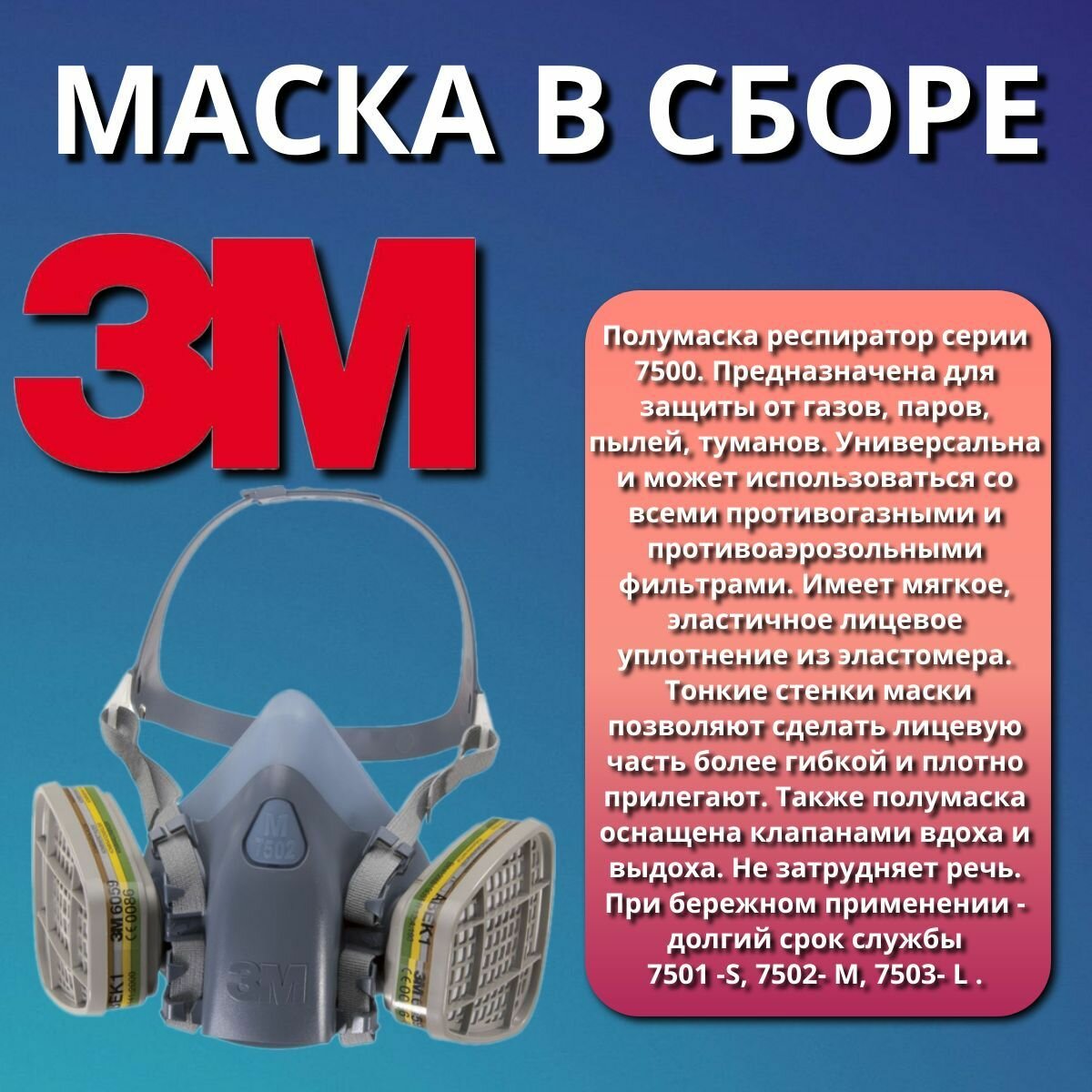 Маска/полумаска силиконовая в сборе 3M 7502 для малярных работ, размер M (Полумаска 3M 7502 , фильтр 3M 6051 , предфильтр 3M 5911 , держатель 3M 501) информация: