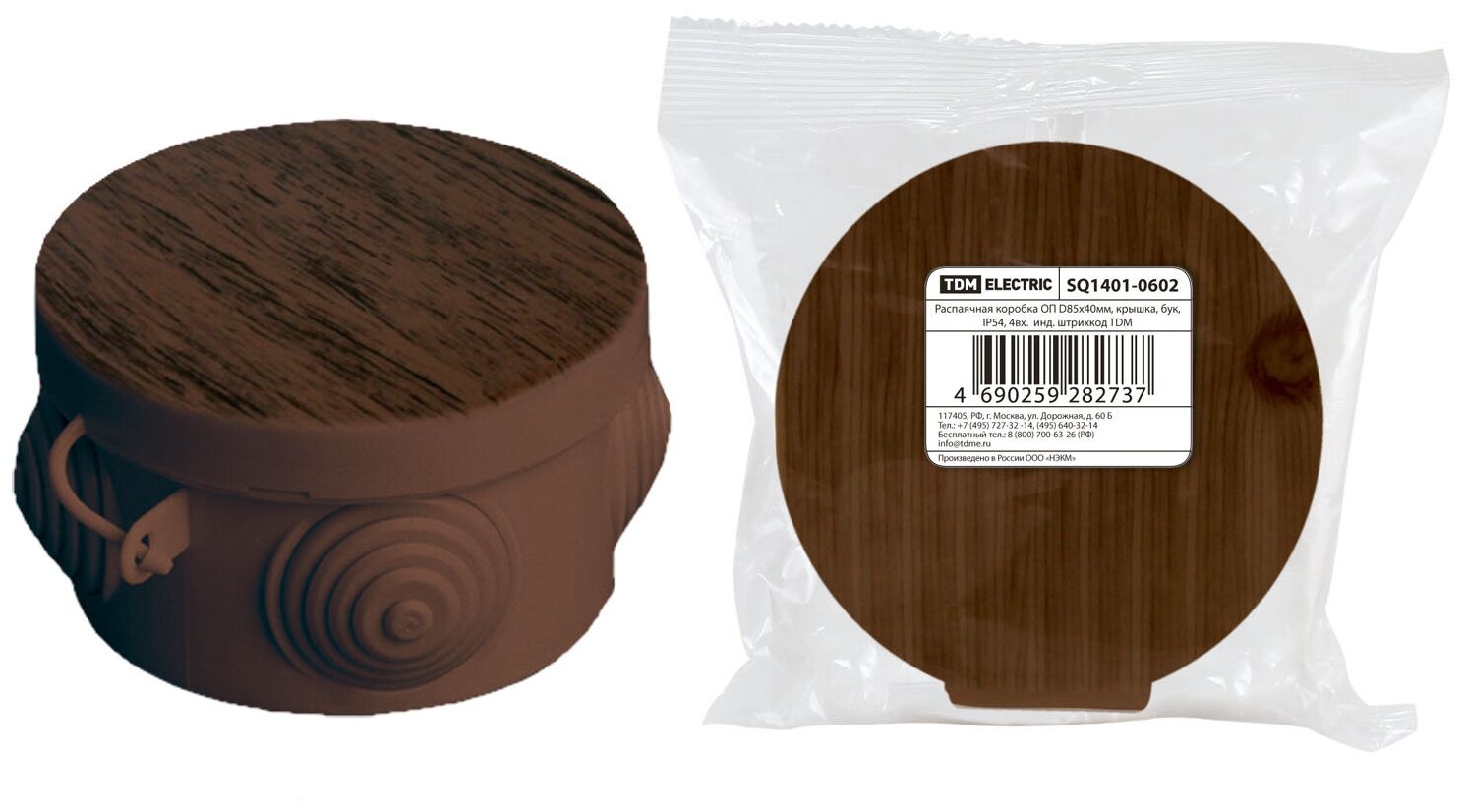 Распаячная коробка ОП D85х40мм, крышка, "ЭКО" (сосна), IP54, 4вх. инд. штрихкод TDM SQ1401-0702