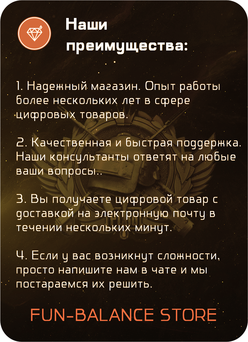 | Инструкция по активации | 1. Перейдите на сайт Midasbuy 2. Выберите свой регион (если вашего региона нет, выберите Others) 3. Войдите в свою учетную запись PUBG, используя Facebook (или создайте нового пользователя на Midasbuy) 4. Нажмите на PUBG Mobile 5. Кликните на значок "redeem" и введите код, предоставленный на этой странице 6. Активируйте код и наслаждайтесь игрой |