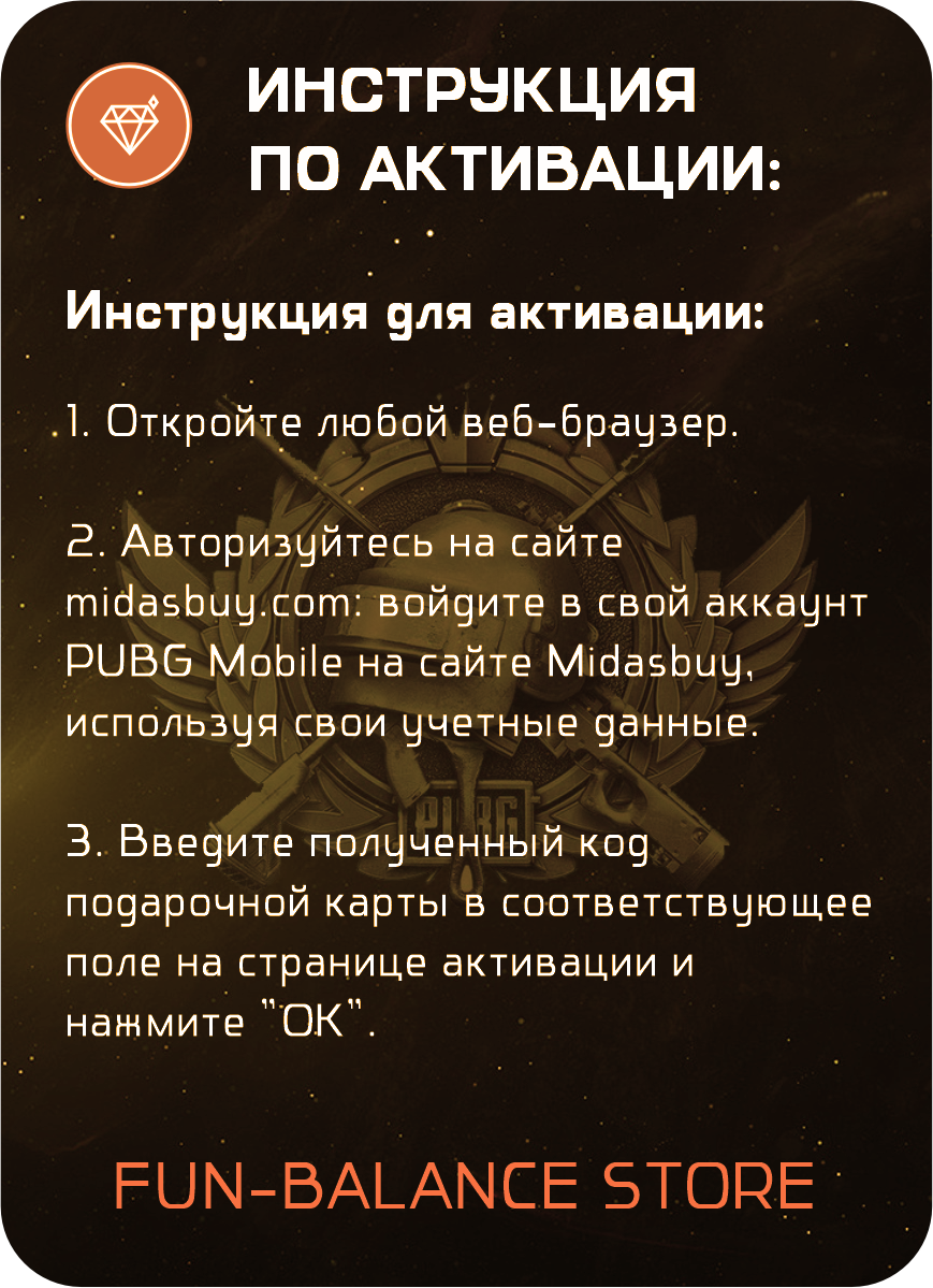 | Инструкция по активации | 1. Перейдите на сайт Midasbuy 2. Выберите свой регион (если вашего региона нет, выберите Others) 3. Войдите в свою учетную запись PUBG, используя Facebook (или создайте нового пользователя на Midasbuy) 4. Нажмите на PUBG Mobile 5. Кликните на значок "redeem" и введите код, предоставленный на этой странице 6. Активируйте код и наслаждайтесь игрой |