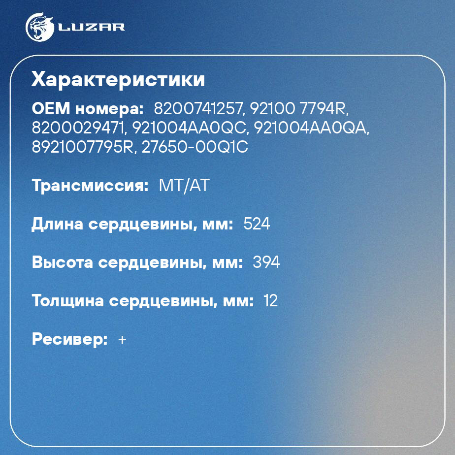 | Дополнительная информация | размер сердцевины, мм: 524*394*12; трансмиссия: M/A; ресивер: + |