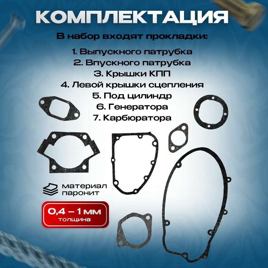 | Подробная комплектация | Прокладка левой крышки картера - 1 штука; Прокладка генератора - 1 штука; Прокладка под цилиндр - 2 штуки; Прокладка Выпускного патрубка - 2 штуки; Прокладка Впускного патрубка (штаны) - 1 штука; Прокладка Карбюратора - 2 штуки; |