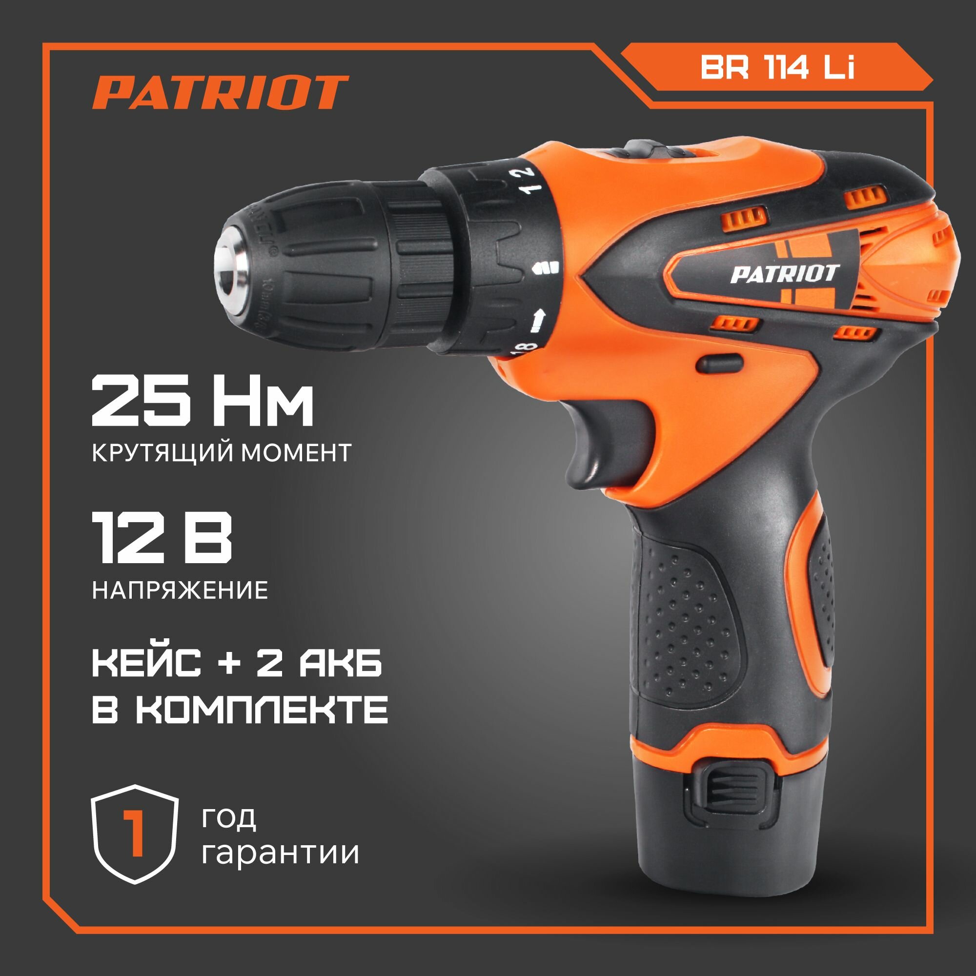 Дрель-шуруповерт аккумуляторная PATRIOT BR 114Li, две АКБ Li-Ion 12В, 2,0 Ач, 2 скорости, кейс