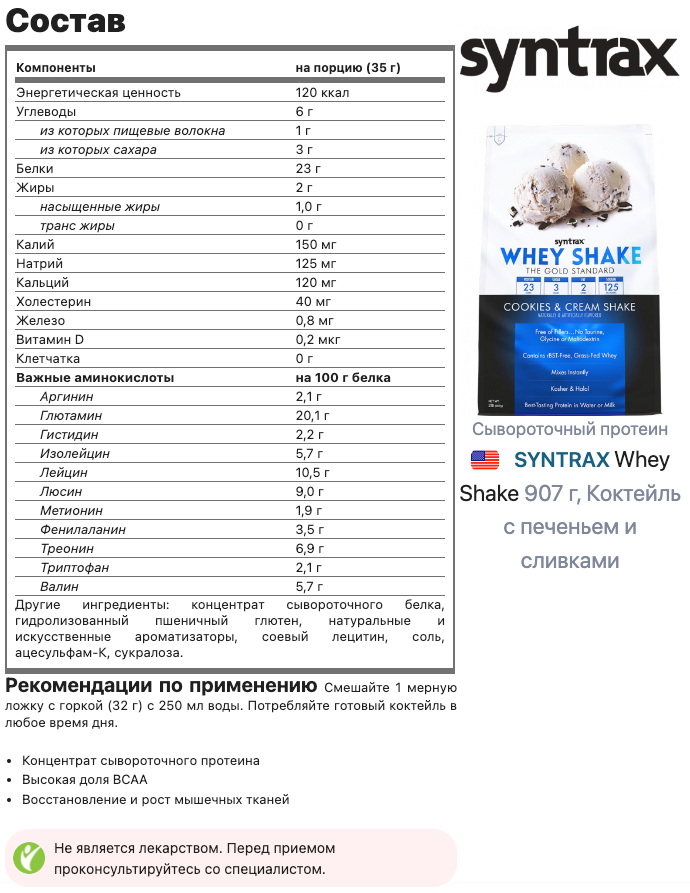 Сывороточный протеин SYNTRAX Whey Shake 907 г, Коктейль с печеньем и сливками информация: