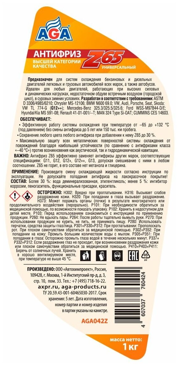 Антифриз-готовый Aga Z65 жёлтый, -65С, 1 кг, 042Z информация: