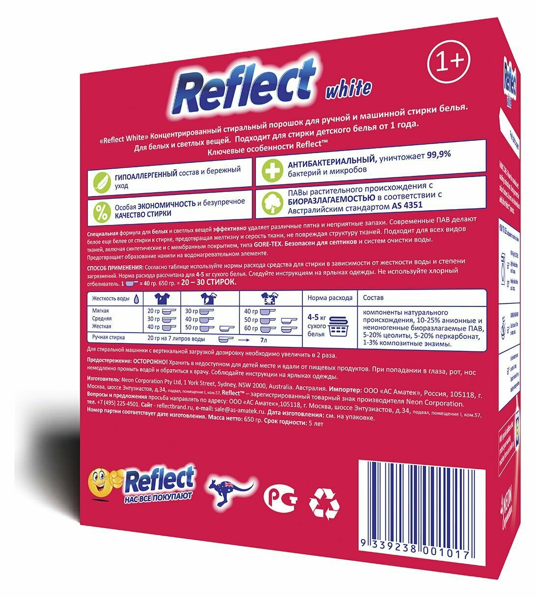 Стиральный порошок Reflect White для белого белья концентрат, 650 г, 2 шт информация: