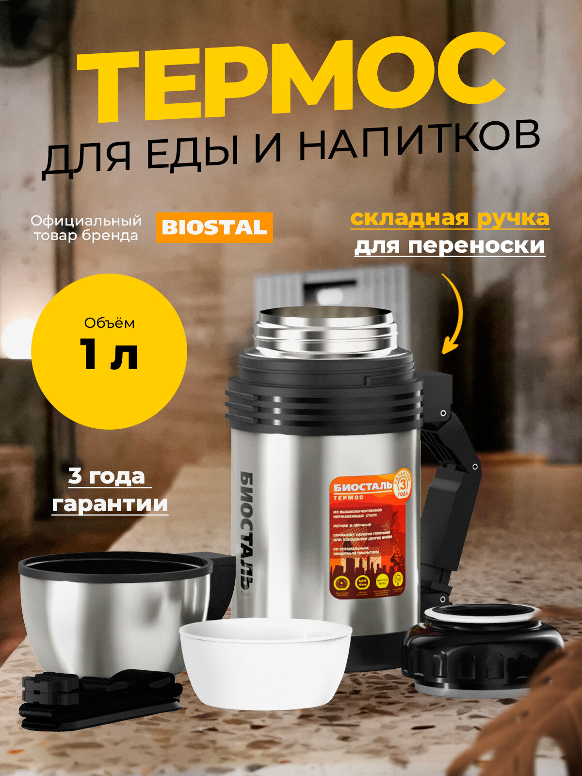Термос 1.0л широкая горловина, сталь, с ручкой и ремешком "Спорт" BIOSTAL информация: