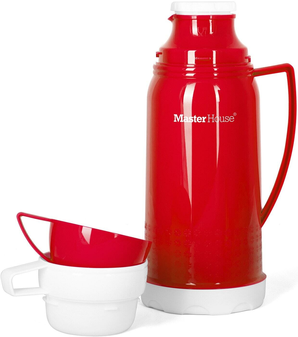 Master House Термос Венеция стекл.колба/пластик, узкое горло, 1л, чашки 2шт, красный,60030/60659 Master House