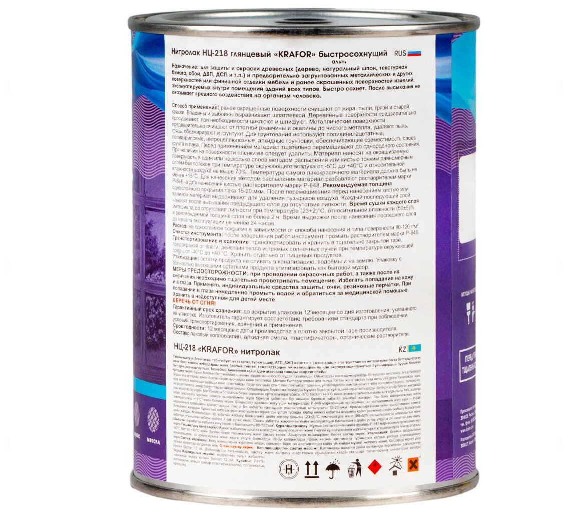 Нитролак НЦ-218 быстросохнущий Krafor, прозрачный, глянцевый, 0,7 кг, 1шт, жестяная банка информация: