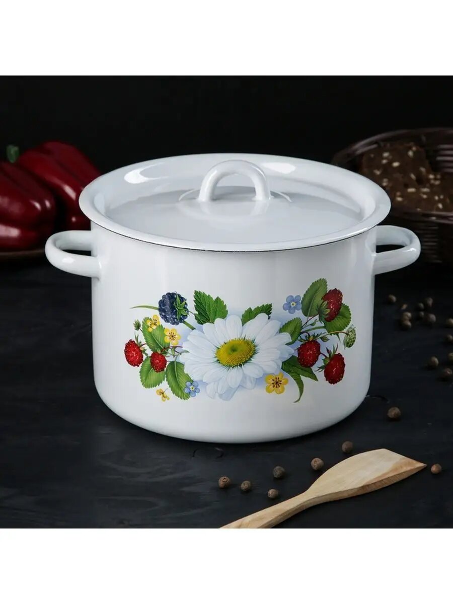Кастрюля эмалированная 1,5 л с ободком белая с рисунком Фруктовая фантазия