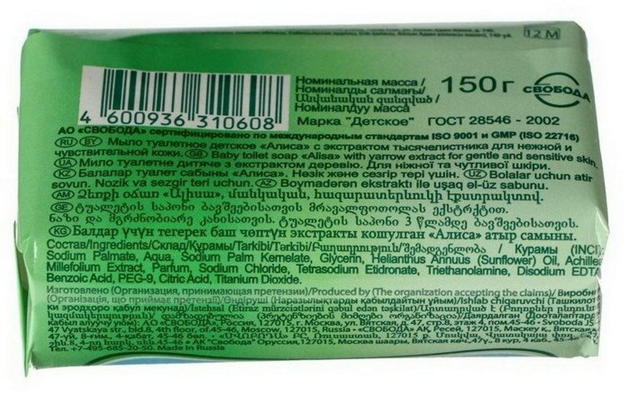 Мыло свобода Алиса для нежной и чувствительной кожи, детское 150г