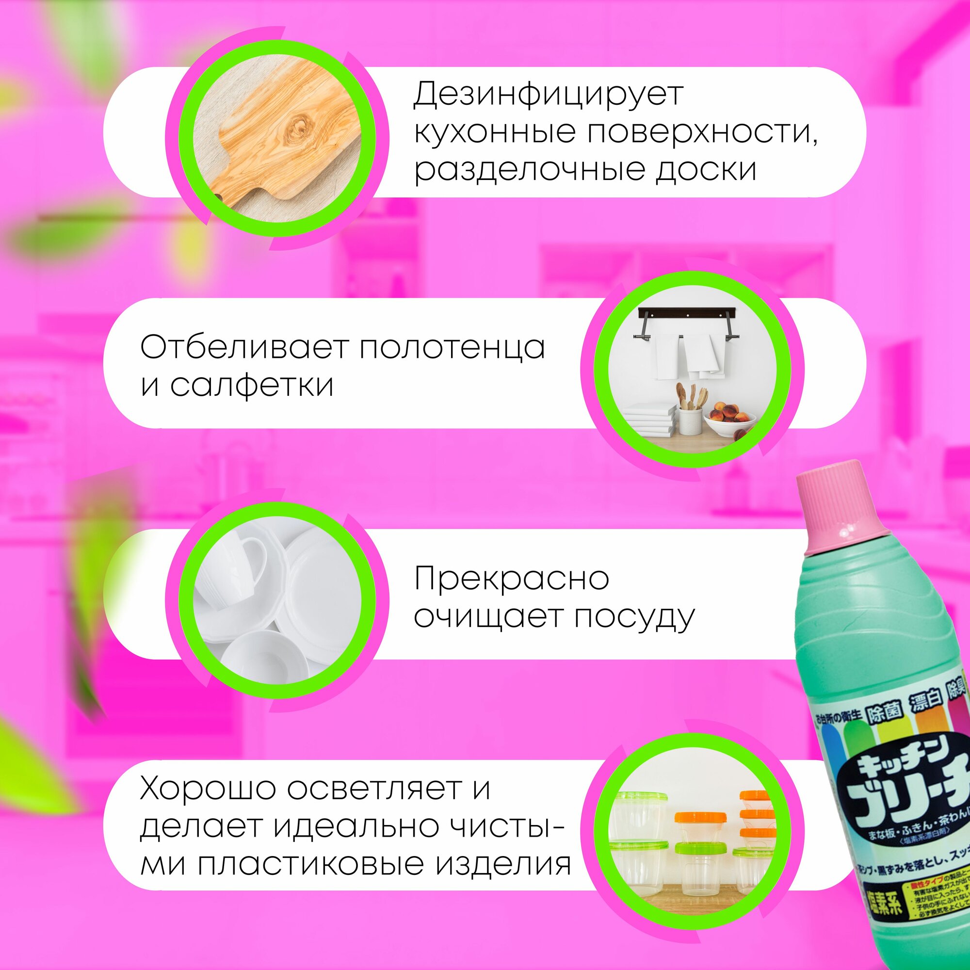 Отзывы на Чистящее средство для кухни Mitsuei Япония 600 мл универсальное, для дезинфекции поверхностей, отбеливания полотенец и салфеток хлорное