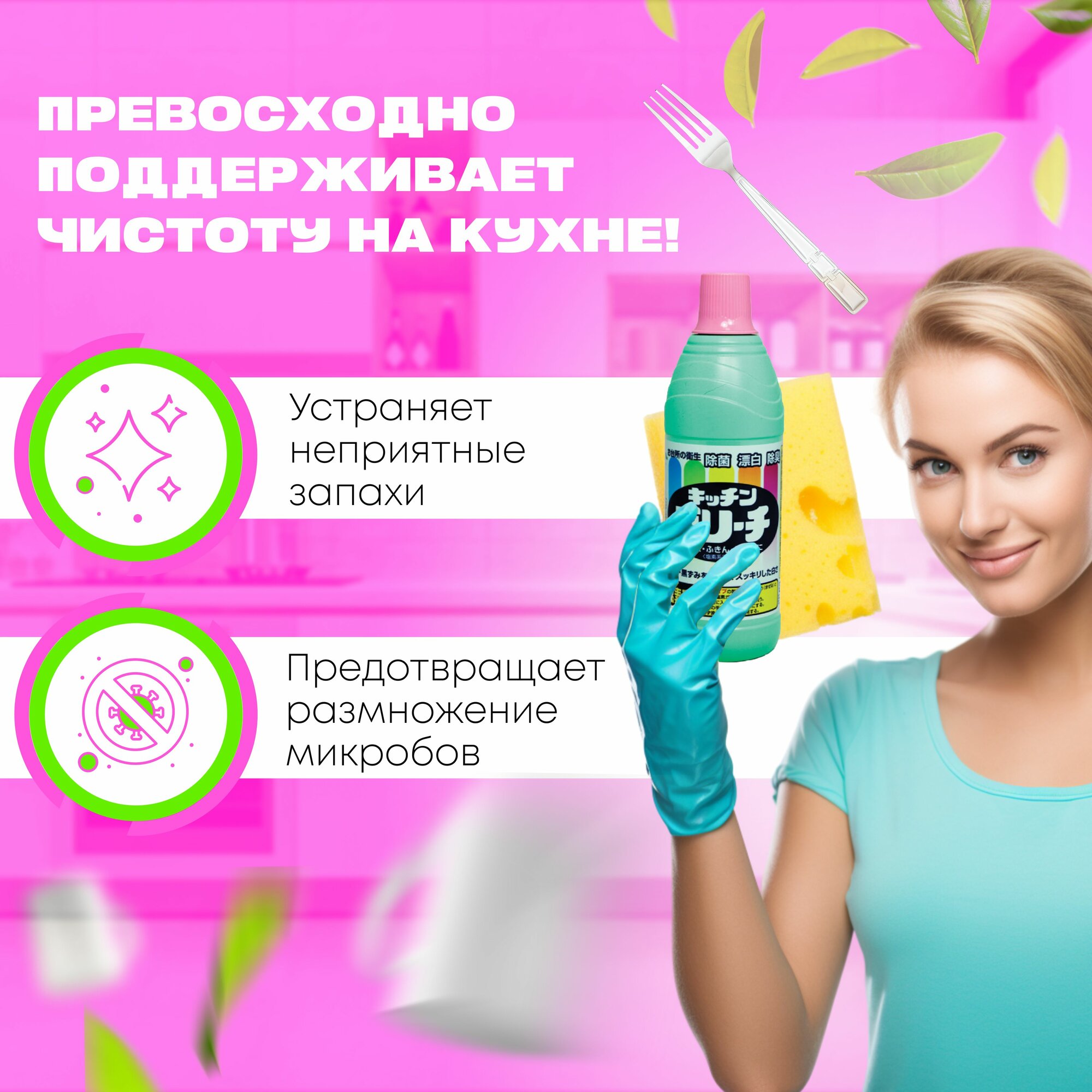 10 цен на Чистящее средство для кухни Mitsuei Япония 600 мл универсальное, для дезинфекции поверхностей, отбеливания полотенец и салфеток хлорное