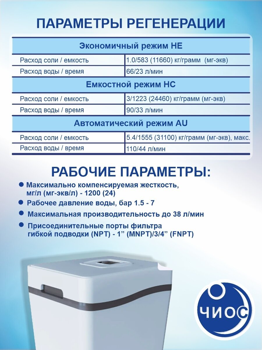 | Плюсы: | Хорошо чистит воду, пока работает регенерация. |