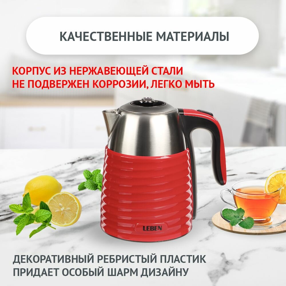 LEBEN Чайник электрический 1,7 л., 2200 Вт., металл-пластик ребристый, бордо