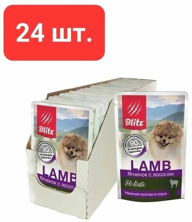 10 цен на Корм для собак влажный Ягнёнок с лососем, для мелких пород 85 г * 24 шт (паучи) Blitz Holistic